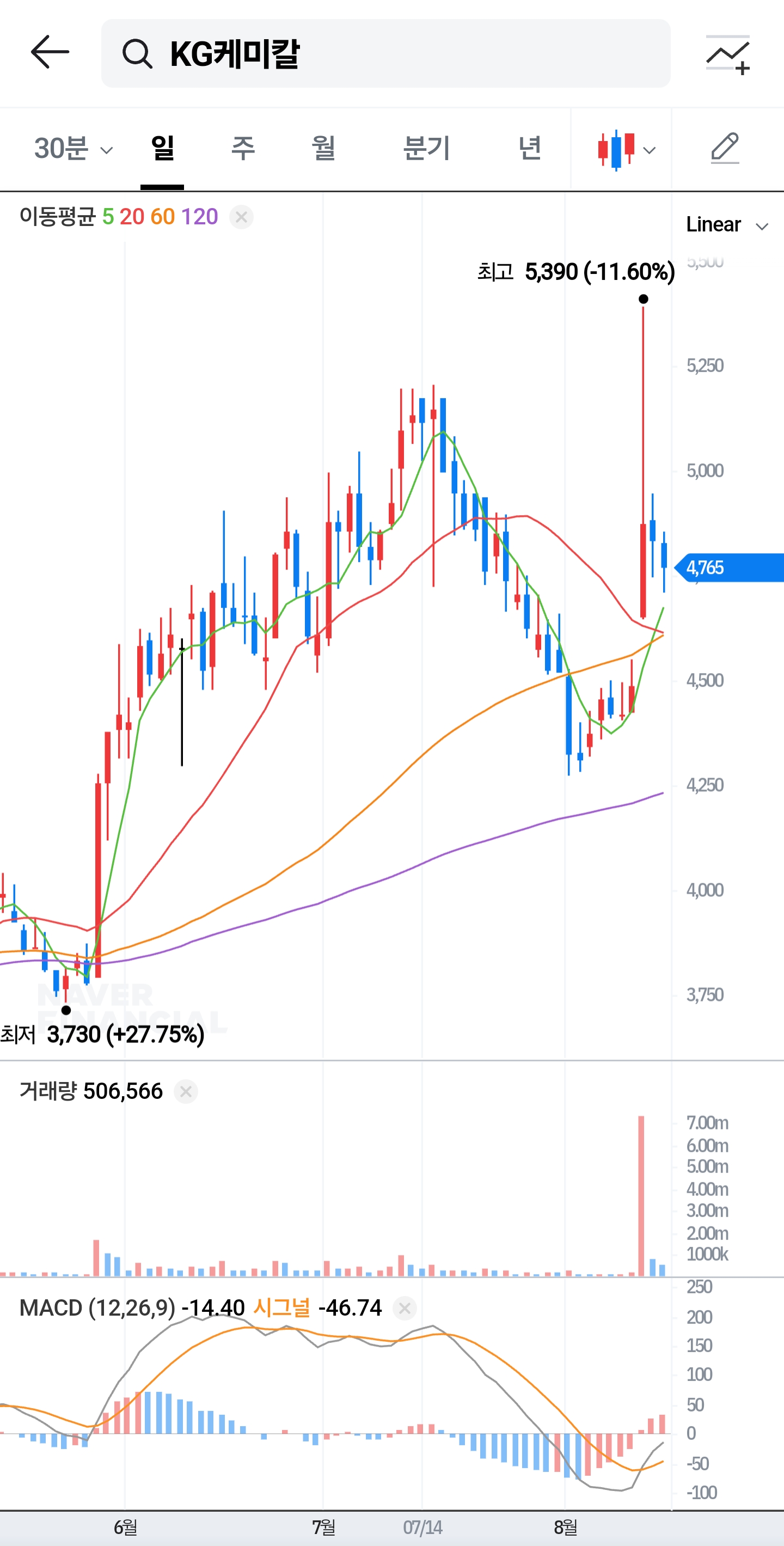 6월 저점 3,730원 → 7월 고점 5,390원까지 가파른 상승(약 +44%).