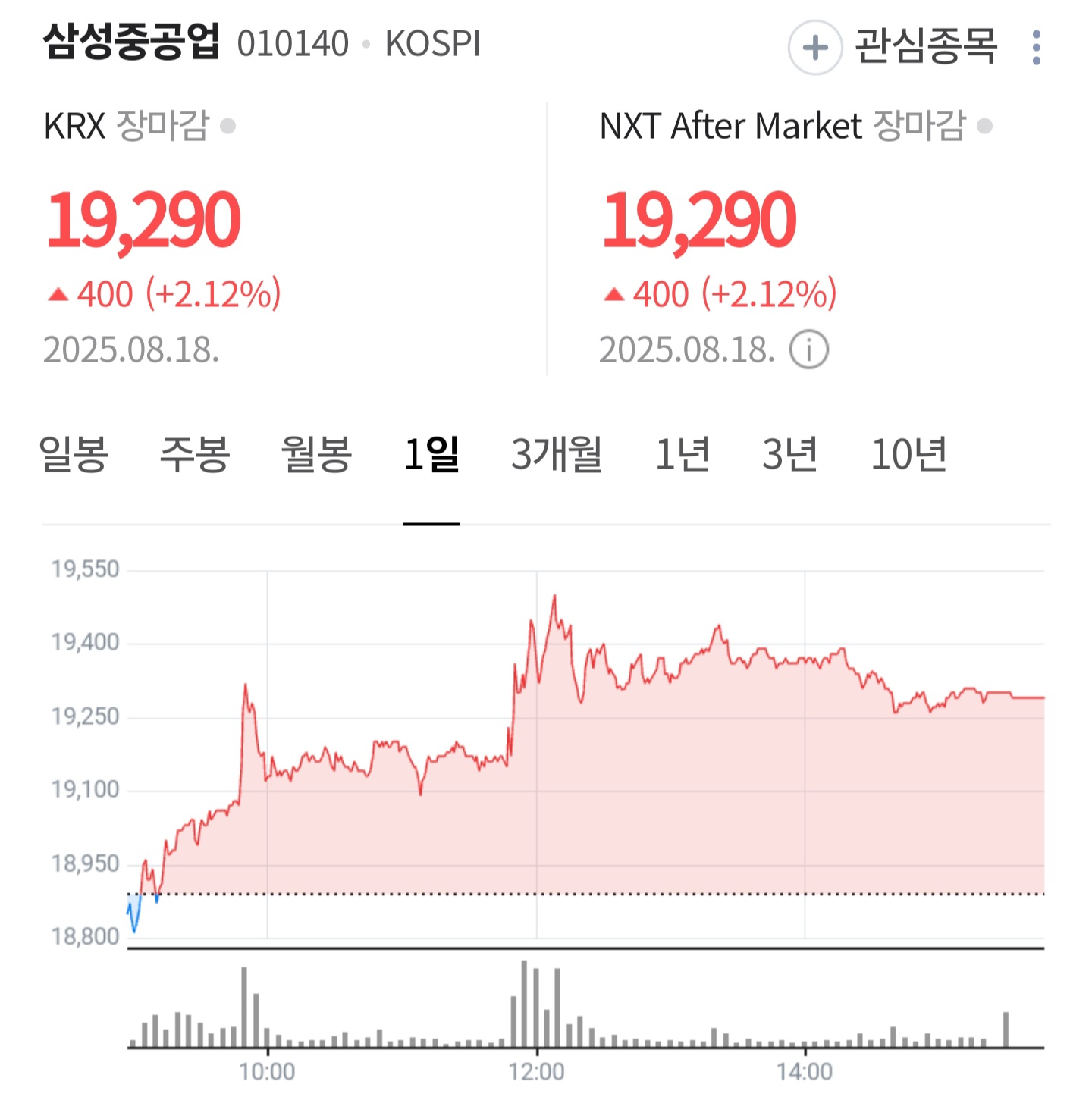 현재: 고점 이후 조정을 거쳐 19,290원(-4.50%)에 마감.