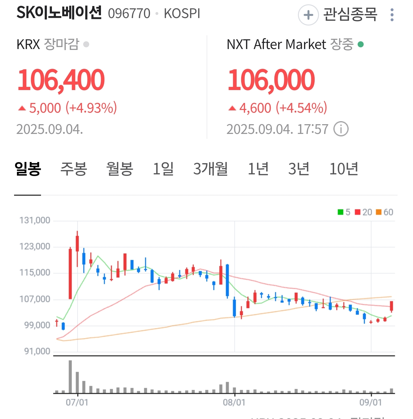 2025년 9월 4일, SK이노베이션 주가는 전일 대비 +4.93% 상승한 106,400원에 마감했습니다. 이날만 해도 +5,000원 상승하면서 최근 발표된 호재(ESS 대형 수주와 정유 부문 실적 개선 기대)에 투자자들이 민감하게 반응하는 모습을 보여주었습니다.