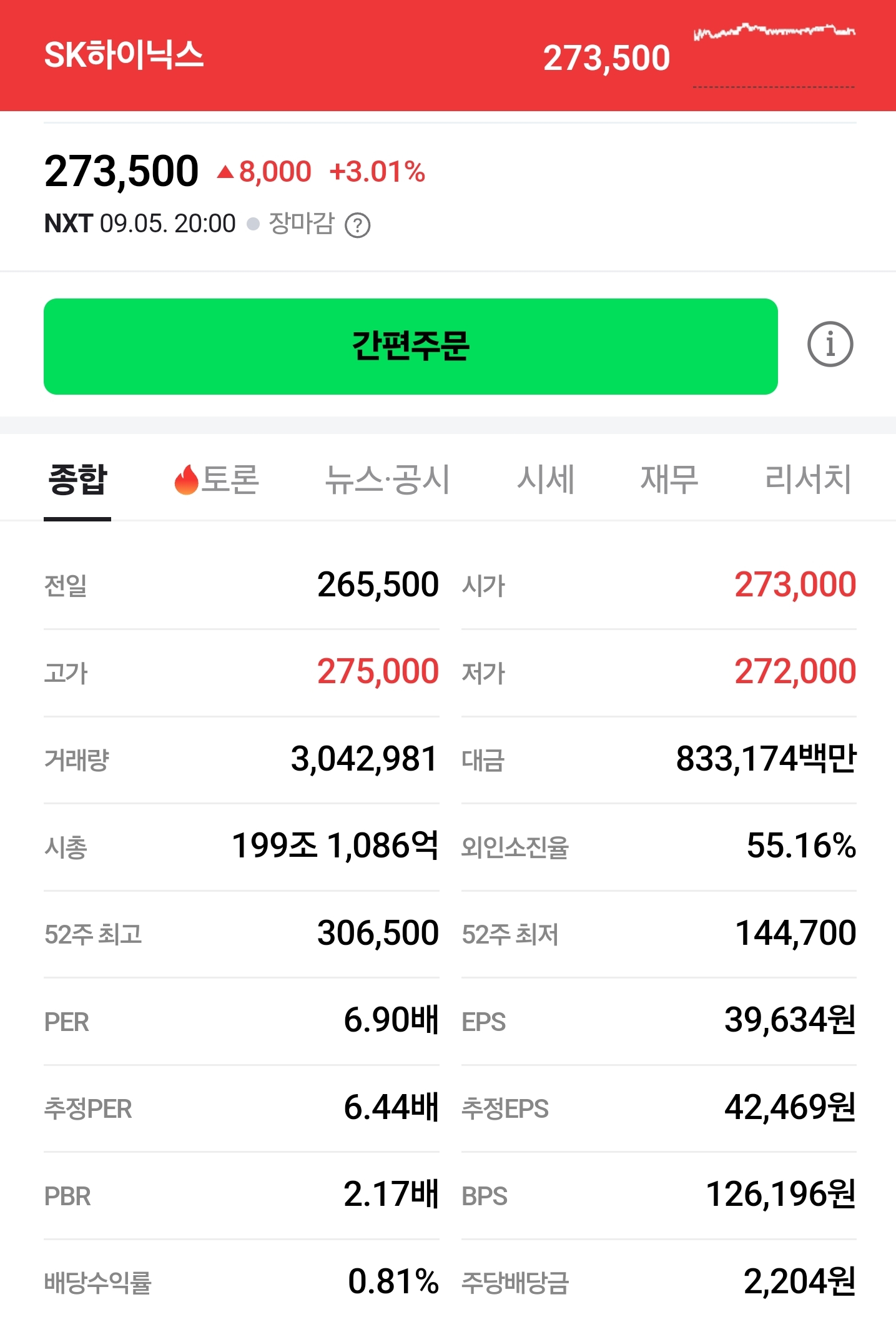 거래량: 약 304만 주, 거래대금: 약 8,331억 원(앱 표기 기준).