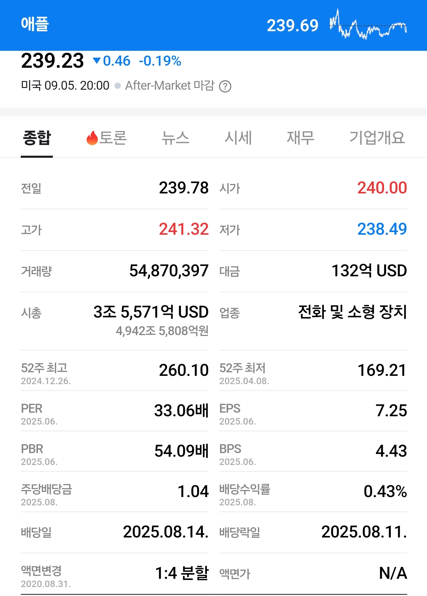 가격 레벨: 241달러가 단기 저항, 돌파/안착 시 260달러(52주 고점) 테스트 시나리오 열림.