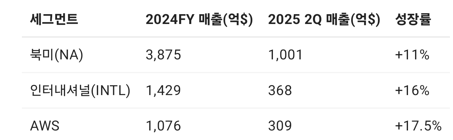 → 북미는 규모의 경제·물류 밀도가 높아 안정적으로 캐시를 뽑아내고, 인터내셔널은 환율·규제·인프라 성숙도에 따라 진폭이 크지만, 이번 분기 성장률은 북미보다 높게 나옴. AWS는 여전히 고마진 성장을 유지.