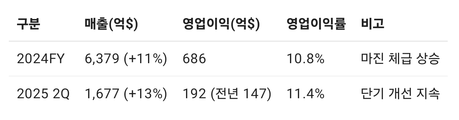 → 전년 대비 **레버리지(영업이익 증가폭 > 매출 증가폭)**가 발생. 같은 1달러의 매출이라도 수익성이 높은 파이프를 더 많이 태웠다는 뜻입니다.