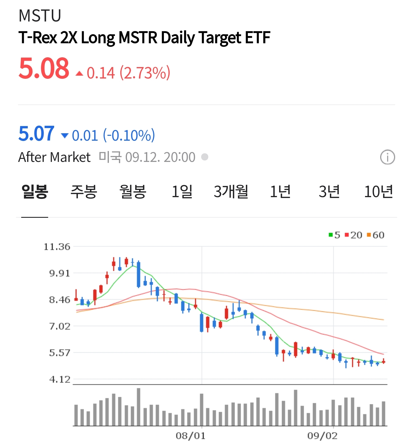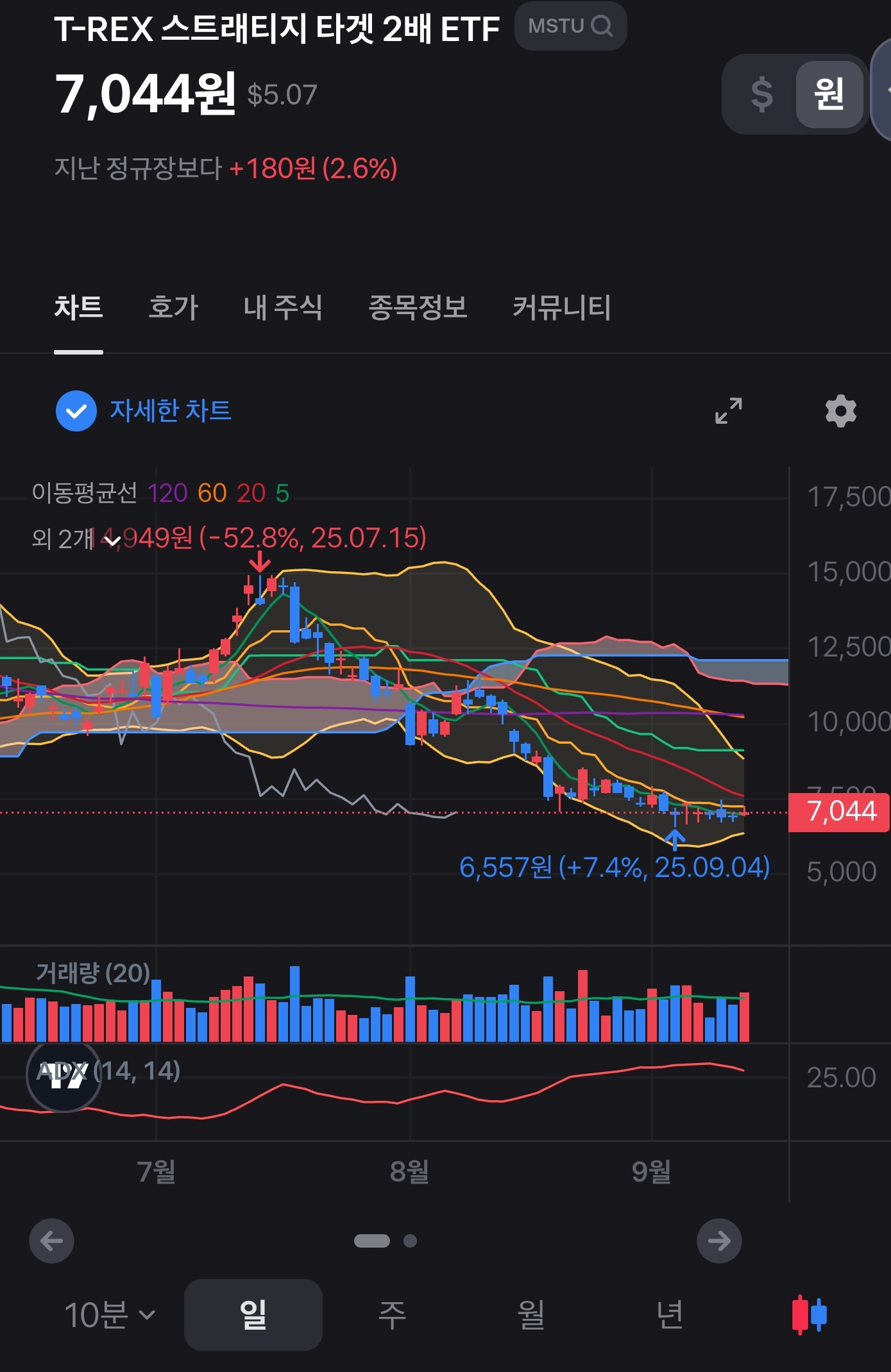 2025년 9월 12일 기준 MSTU의 주가는 **7,044원(미화 약 $5.07)**입니다. 불과 두 달 전, 7월 중순에는 14,000원대까지 올라 있었죠. 수치만 놓고 보면 약 −50% 이상의 급락입니다. 레버리지 ETF의 본질을 보여주는 전형적 장면입니다.