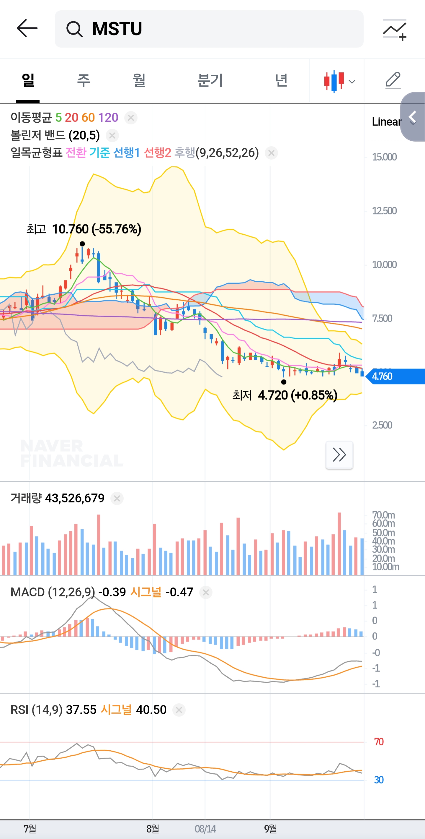 MSTU의 일봉 차트를 보면, 최근 몇 달 동안의 극심한 변동성이 고스란히 드러납니다. 주가는 한때 10.76달러까지 치솟았지만 이후 급락을 거듭하며 4.72달러까지 떨어졌습니다. 단기간에 무려 -55% 이상 조정을 받은 것입니다. 현재는 4.76달러 부근에서 바닥을 다지려는 움직임이 나타나고 있습니다.