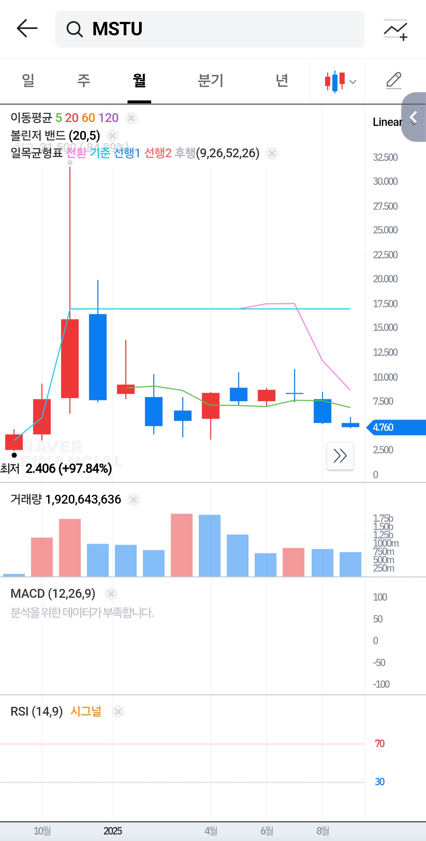 월봉 차트는 MSTU의 본질적인 성격을 보여줍니다. 과거 최저 2.40달러에서 최고 17달러대까지 급등했던 극단적인 변동성이 그대로 나타납니다. 현재는 4~5달러대 박스권에 머무르며 방향성을 잃은 상태입니다.