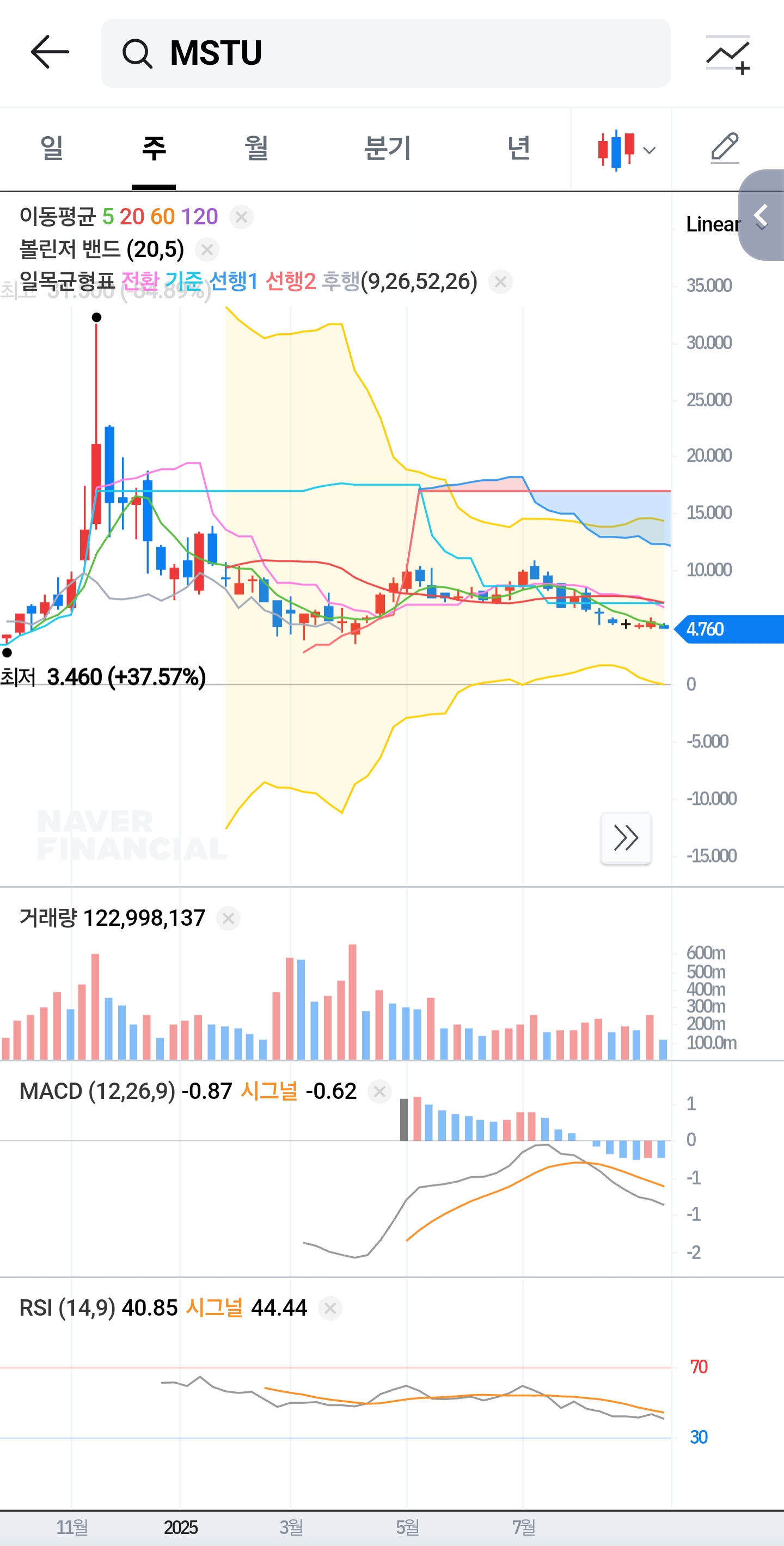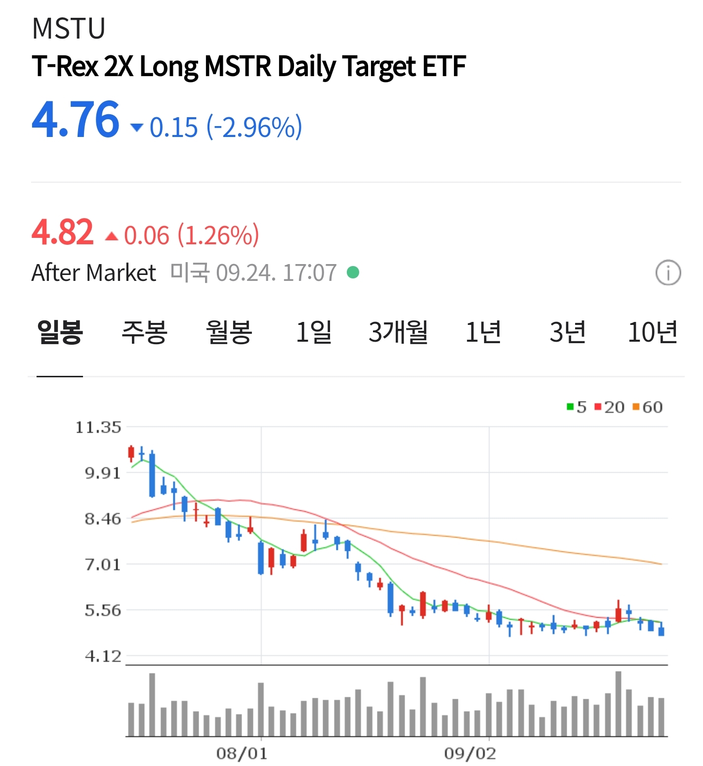 MSTU의 일봉 차트를 보면, 최근 몇 달 동안의 극심한 변동성이 고스란히 드러납니다. 주가는 한때 10.76달러까지 치솟았지만 이후 급락을 거듭하며 4.72달러까지 떨어졌습니다. 단기간에 무려 -55% 이상 조정을 받은 것입니다. 현재는 4.76달러 부근에서 바닥을 다지려는 움직임이 나타나고 있습니다.