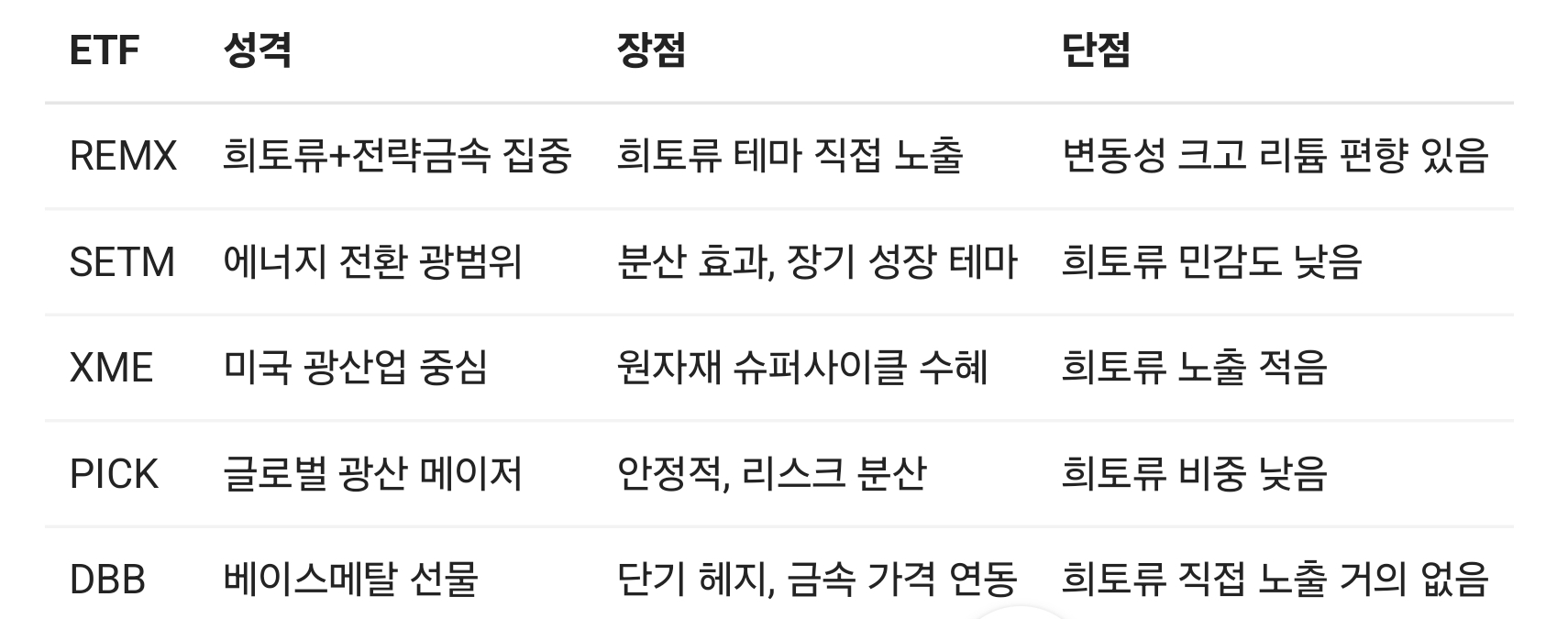 희토류 투자는 개별 광산주(MP Materials, Lynas 등)에 집중할 수도 있지만, 변동성이 크고 정책 리스크가 심하기 때문에 ETF를 통한 분산투자가 한 방법이 됩니다. 다만 주의할 점은, 현재 미국 시장에 상장된 ETF 중 “희토류만 100% 담는 ETF는 거의 없고”, 대부분은 **전략 금속(Strategic Metals)**이나 광산·배터리 금속 전체를 묶어서 담는 구조라는 점입니다.