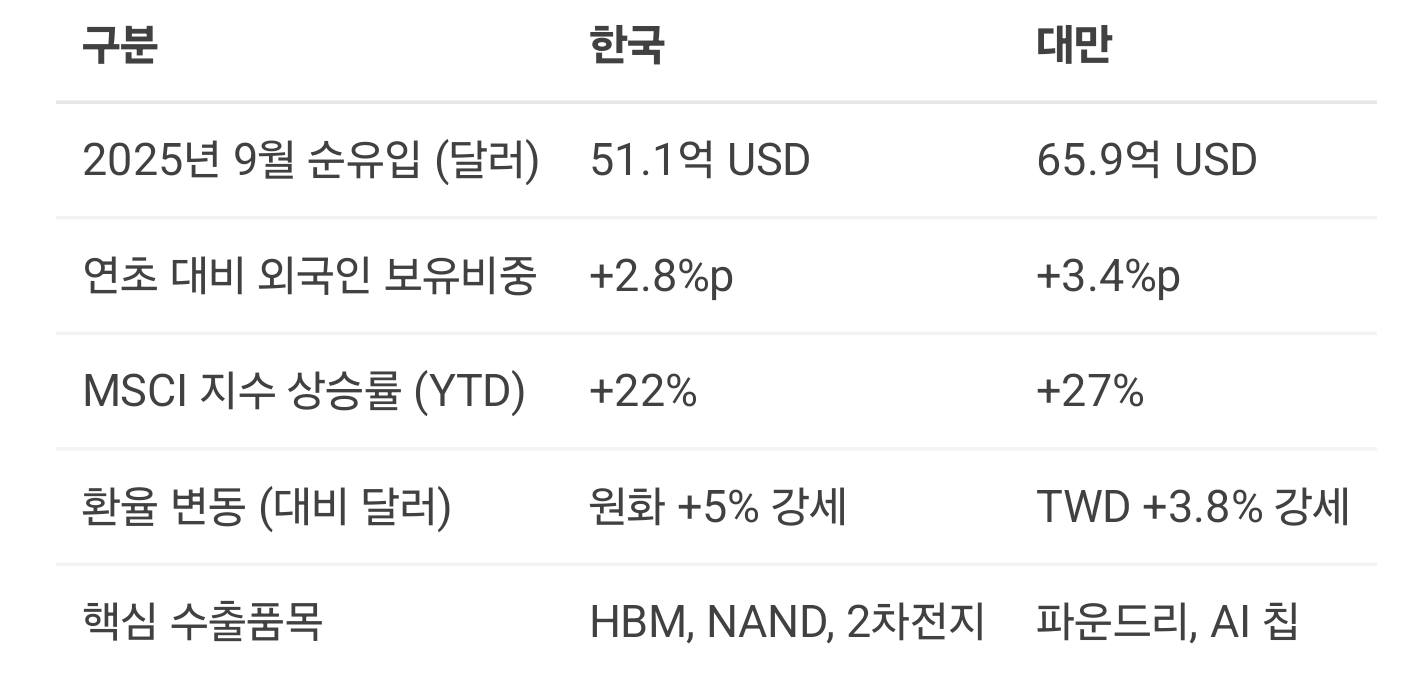 이러한 수출 회복은 외국인 투자자들에게 “달러 약세 + 성장 확인 + AI 붐 확산”이라는 세 요소가 맞물린 완벽한 타이밍으로 작용했습니다.