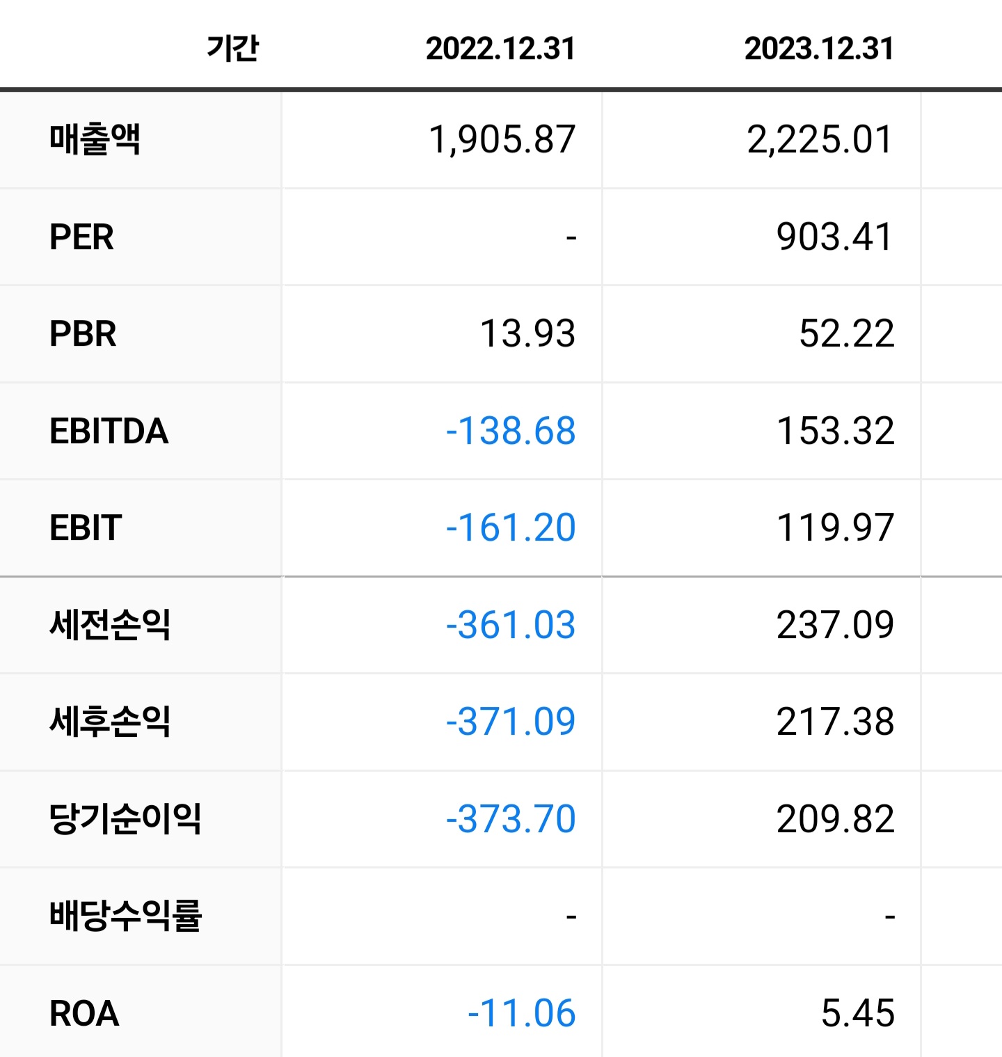 2022년까지는 적자였고, PBR도 13~50배 수준이었으나 2025년 들어 이익 기반 지표가 나타나면서 PER·ROA 등 실적 기반 지표도 급상승 중이다.