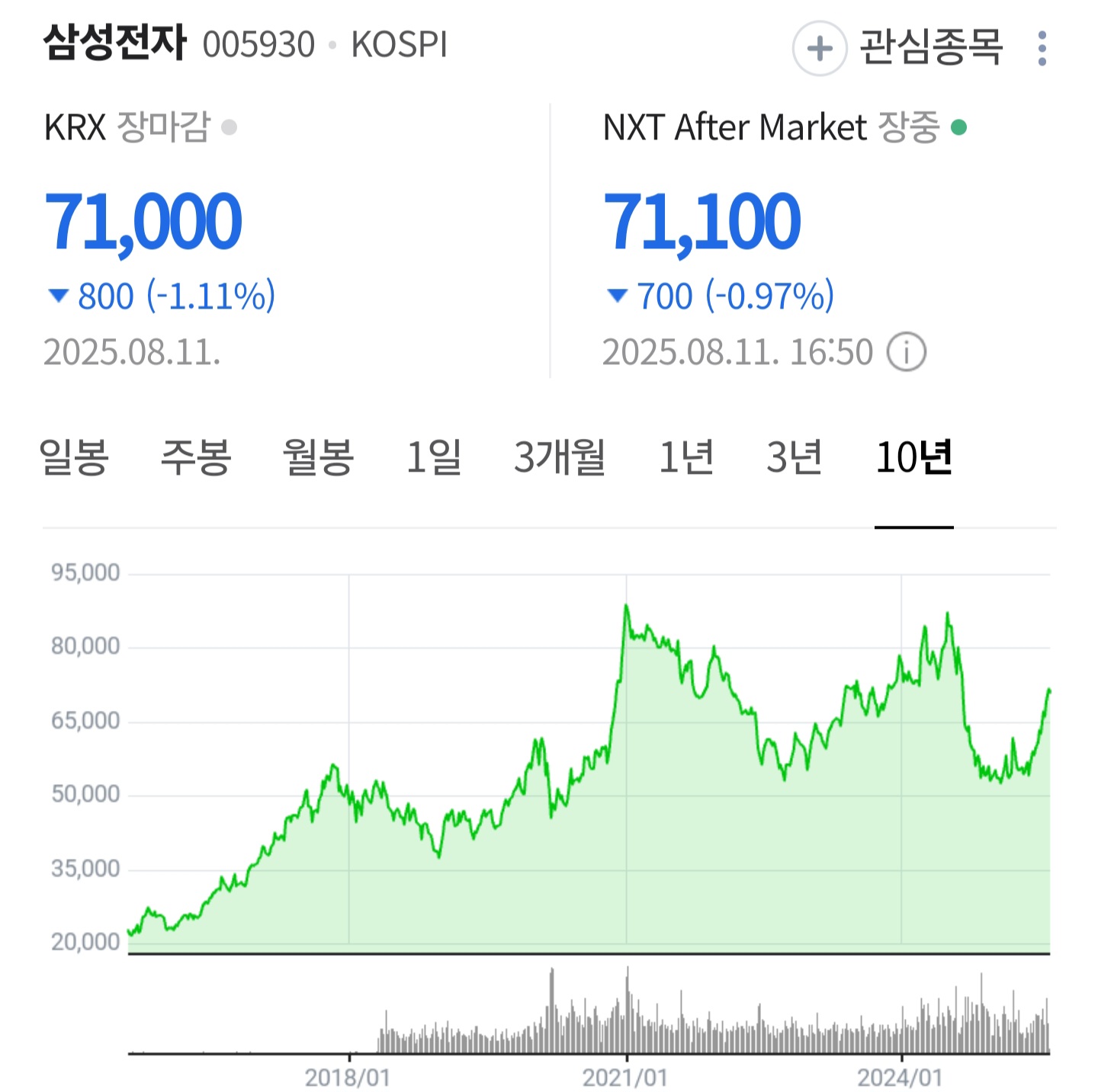 2025.08.11 종가: 71,000원 (전일 대비 ▼1.11%)