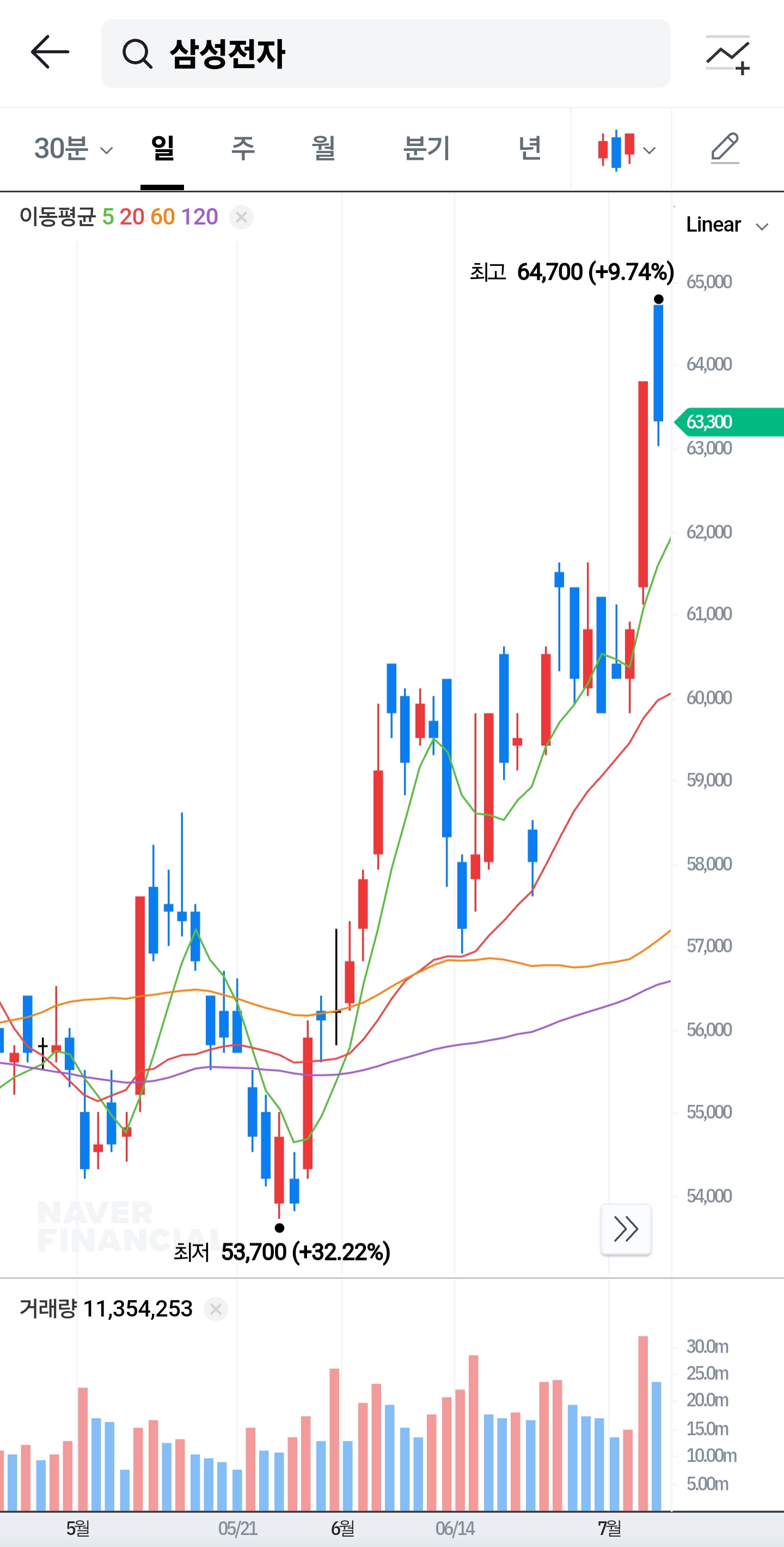 아래는 삼성전자 일봉 차트입니다. (출처: 네이버금융)