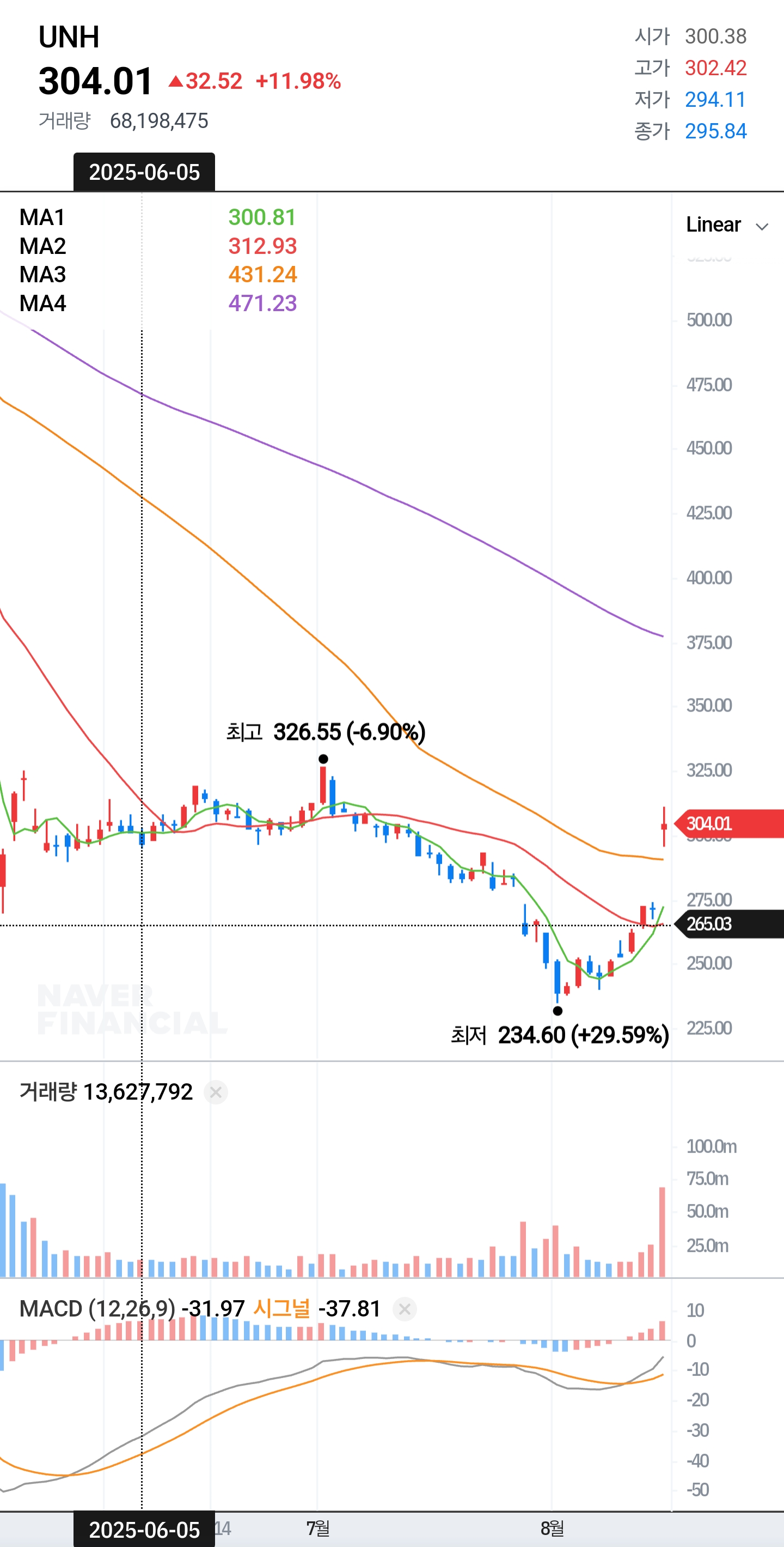 ※ 해석: 좌상단 UNH 304.01(+11.98%) 급등, 캔들 오른쪽에 4개 이평(MA1~MA4), 하단에 거래량 스파이크와 MACD(12,26,9).