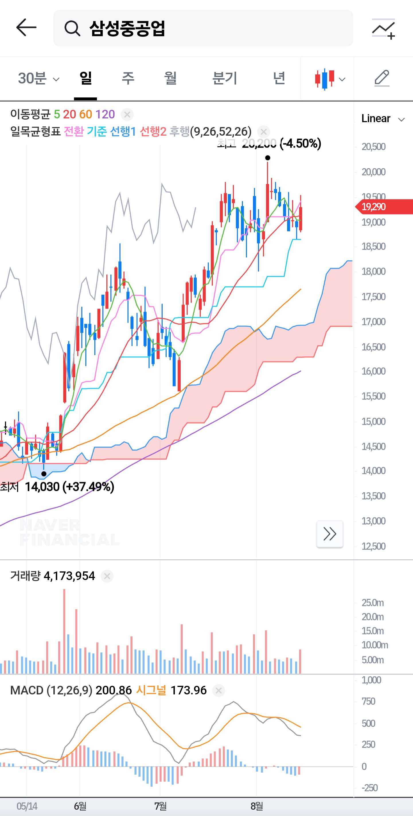 현재: 고점 이후 조정을 거쳐 19,290원(-4.50%)에 마감.