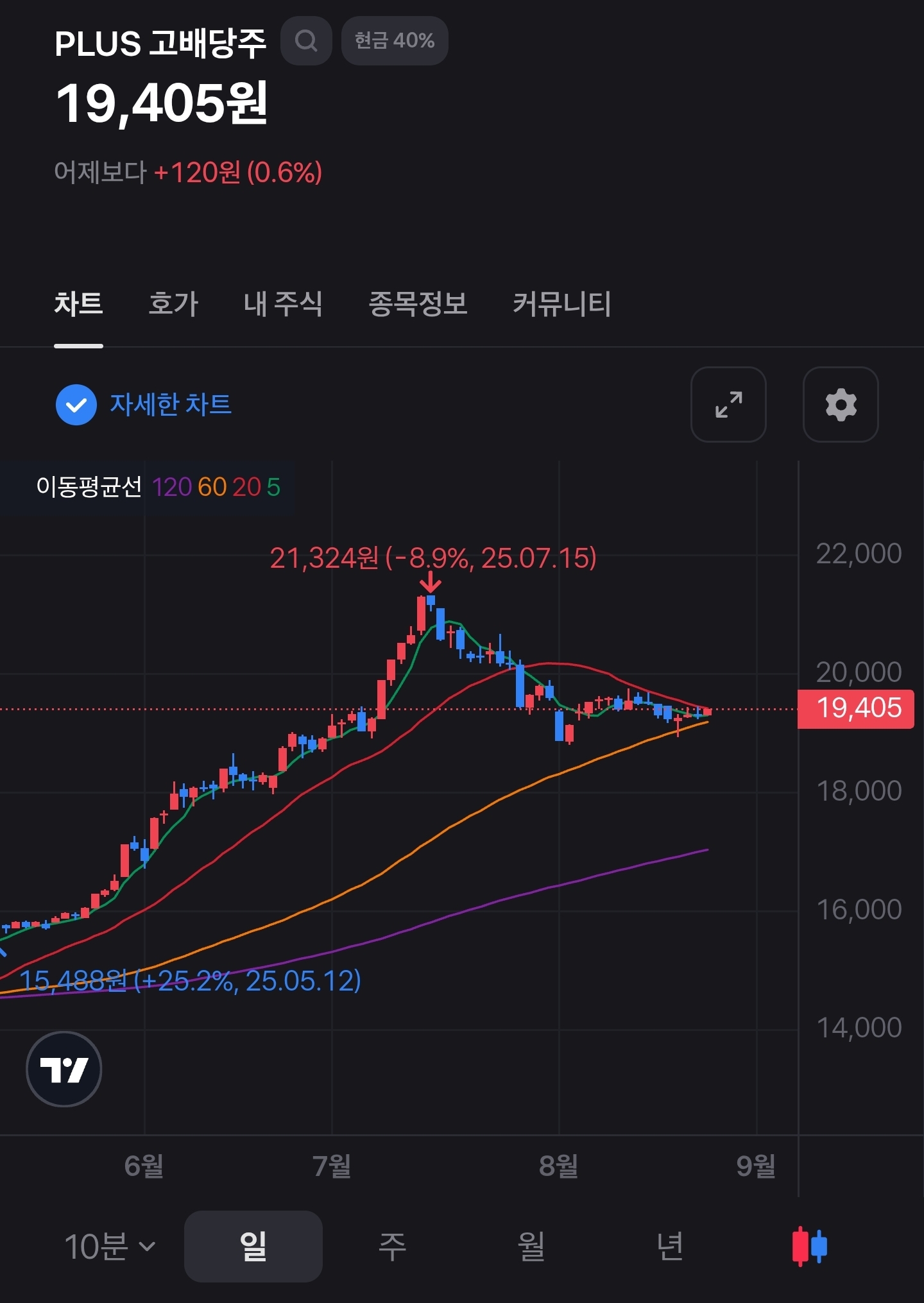 이런 흐름은 고배당 ETF 특성상 흔히 나타납니다. 배당 성향이 높은 기업들이 포함되어 있어 급락은 제한되지만, 고점에서는 차익 실현 매물이 나와 단기 조정을 겪는 것이죠.
