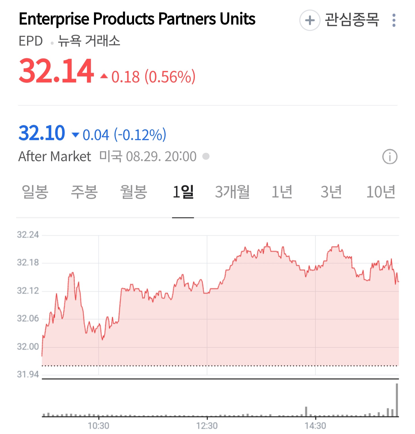 2025년 8월 29일 기준, 엔터프라이즈 프로덕츠 파트너스의 주가는 **32.14달러(한화 약 44,600원)**입니다. 최근 일중 고가는 32.22달러, 저가는 31.72달러였으며 거래량은 약 300만 주로 집계되었습니다.