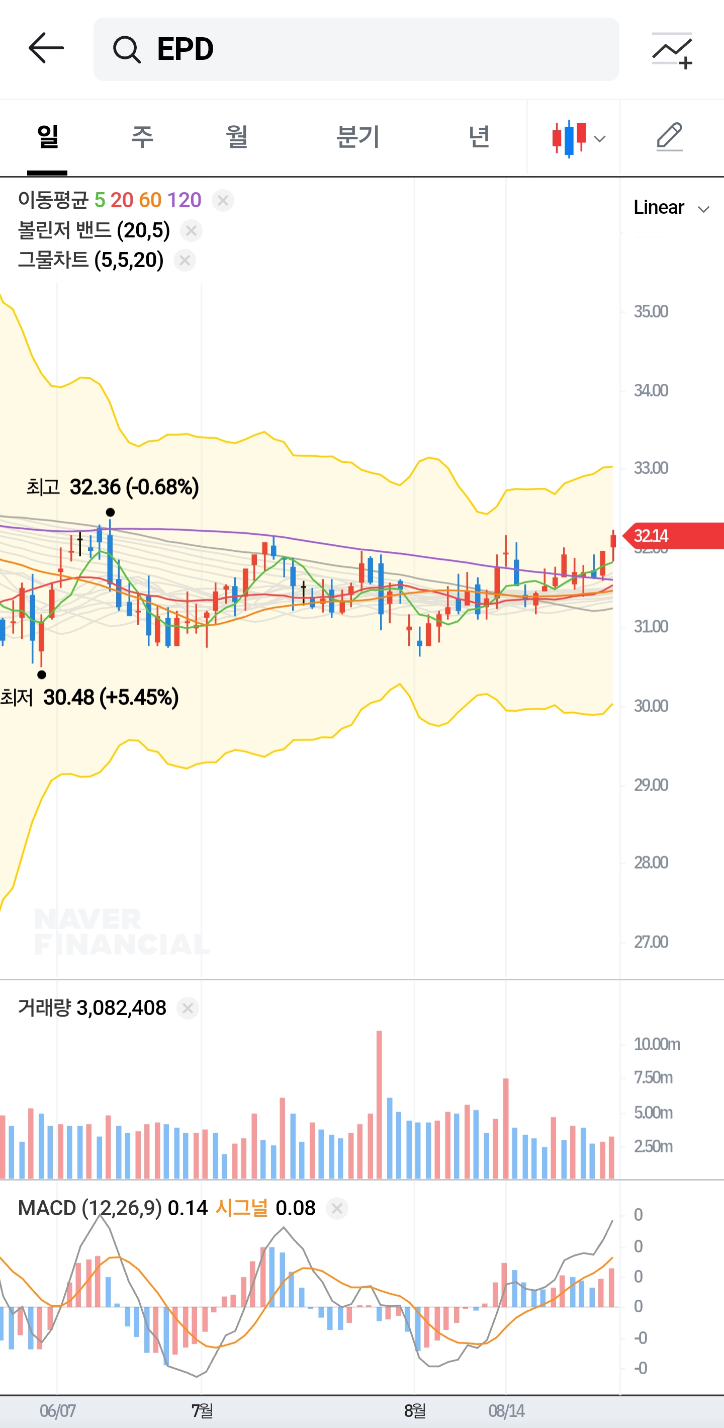 투자자 입장에서 EPD는 단기 차익보다는 장기 보유와 배당 수익에 최적화된 종목입니다. 차트 상으로도 큰 폭의 급등락보다는 안정적 상승을 그리는 종목이기에, 포트폴리오에서 ‘든든한 기둥’ 역할을 할 수 있습니다.