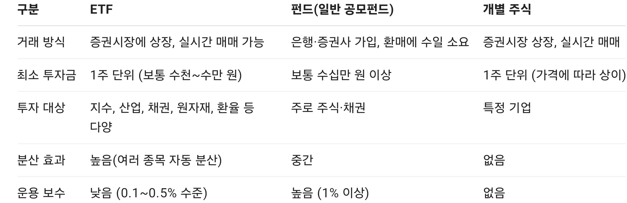 8. ETF와 펀드, 개별주식의 차이 (비교표)