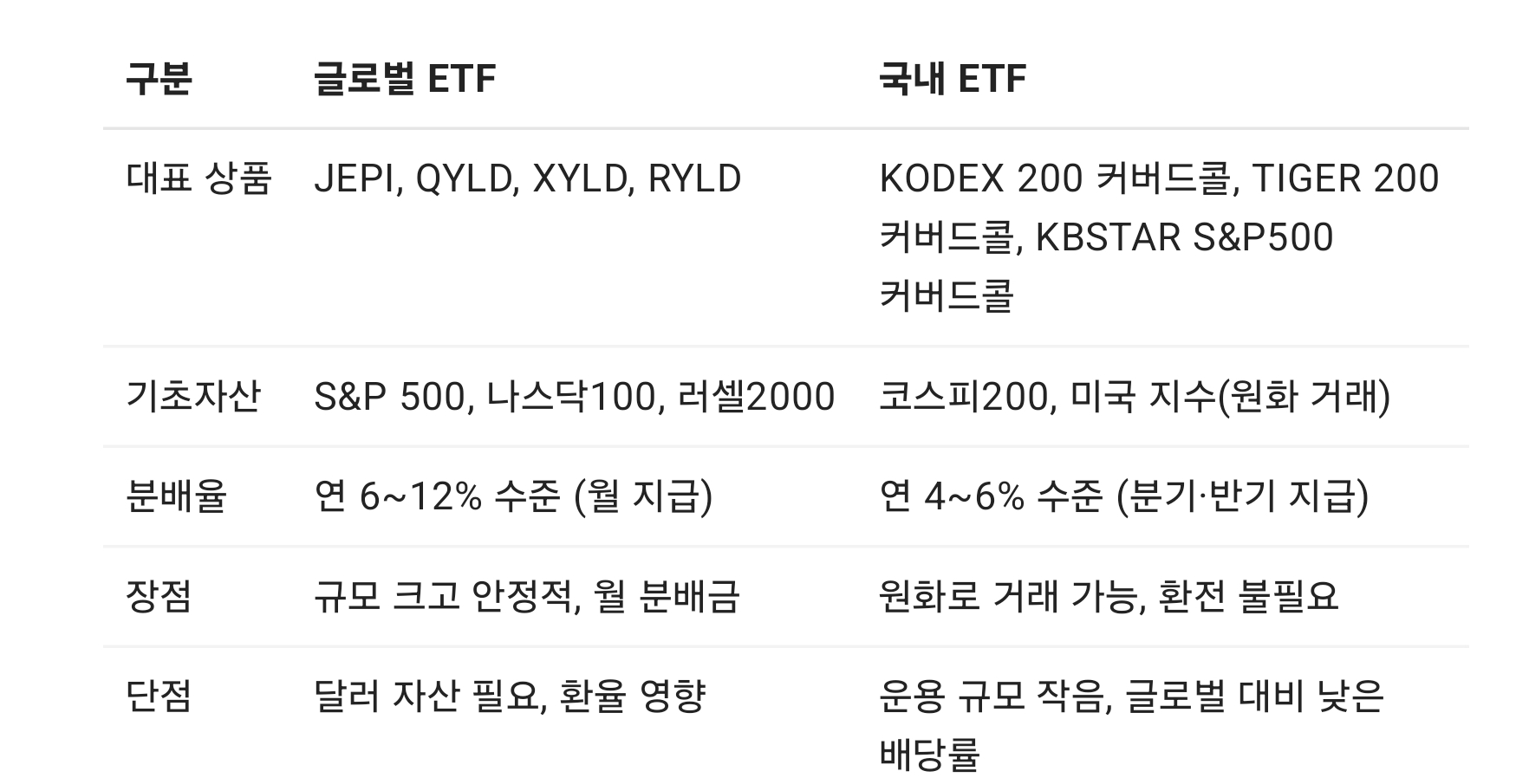 ๐ 3. ๊ธ๋ก๋ฒ vs ๊ตญ๋ด ์ปค๋ฒ๋์ฝ ETF ๋น๊ต ์์ฝ