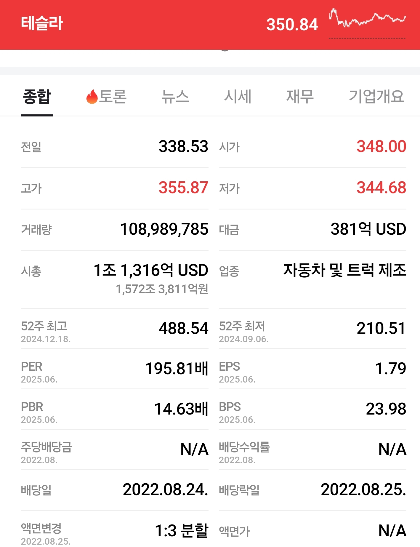 PER(주가수익비율): 무려 195.81배에 달합니다. 이는 같은 자동차 제조업 평균 PER이 10~20배 수준인 것과 비교하면 상당히 높은 수준입니다. 시장이 현재의 실적보다는 미래 성장성에 더 높은 가치를 부여하고 있다는 방증이기도 합니다.