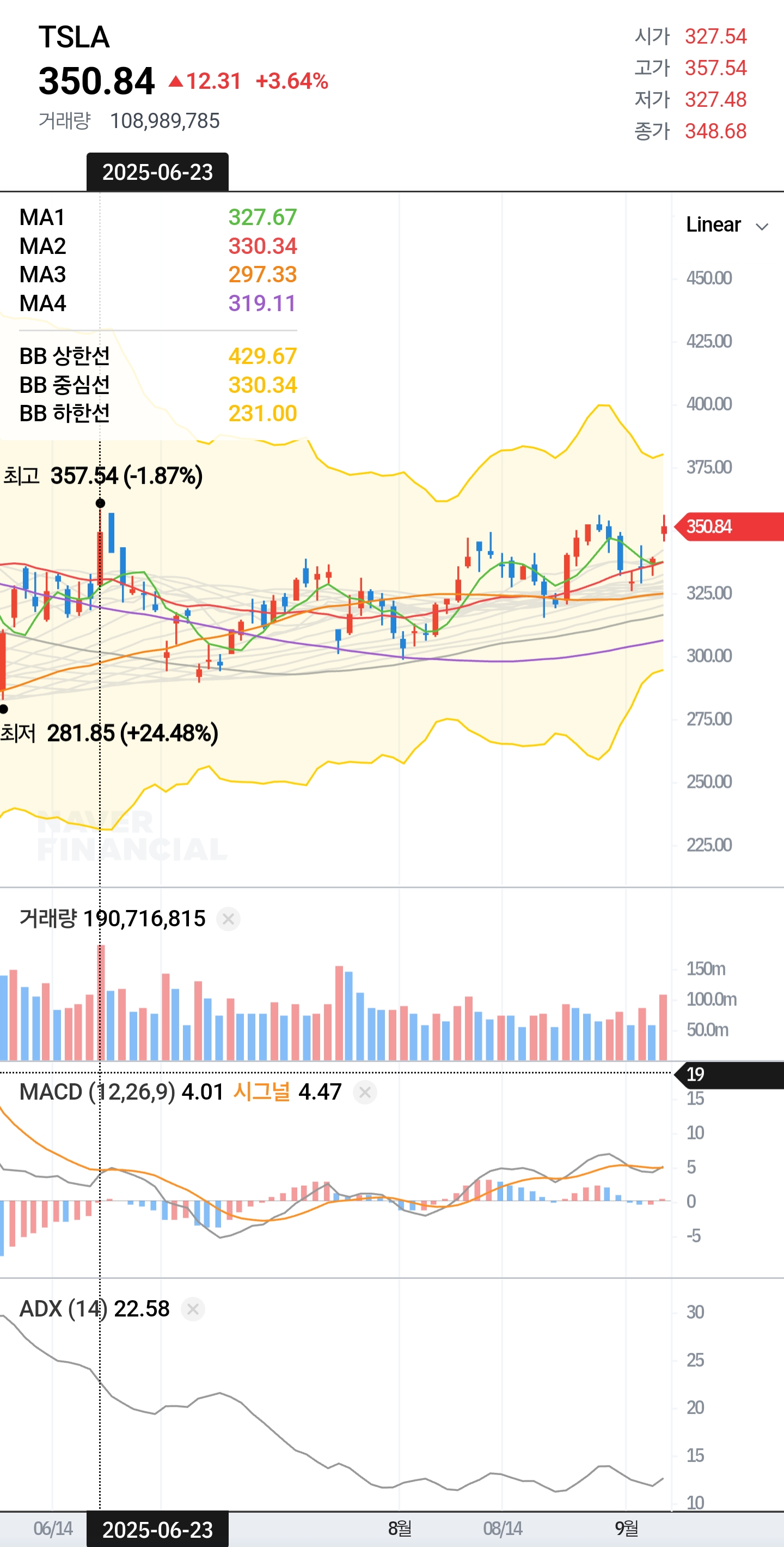현재 테슬라 주가는 350.84달러(전일 대비 +3.64%) 수준에서 거래되고 있습니다. 2024년 9월 최저점 210.51달러에서 바닥을 찍은 후 점진적인 반등세를 이어왔고, 2024년 12월 기록한 52주 최고가 488.54달러에는 다소 못 미치지만 여전히 견조한 흐름을 보이고 있습니다. 최근 3개월 동안 주가는 300달러 초반에서 360달러 사이 박스권을 형성하며 단기적인 등락을 반복했는데, 이는 투자자들이 향후 실적과 전기차 수요 둔화 가능성을 저울질하면서 매수·매도세가 팽팽하게 맞서는 구간으로 해석할 수 있습니다.