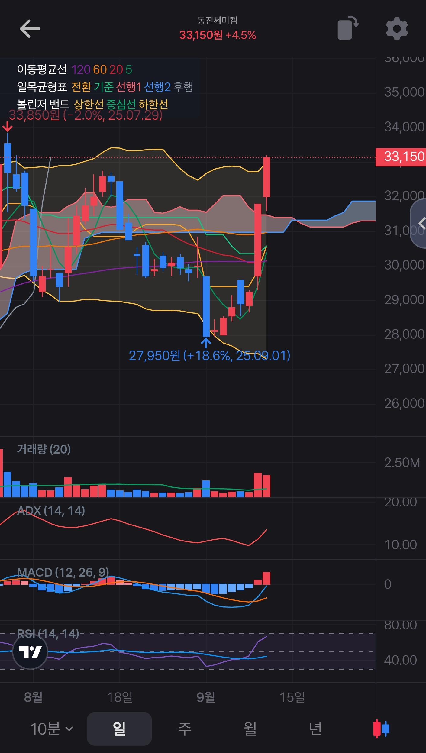 “9월의 동진쎄미켐은 **‘뉴스 급등주’**가 아니라, 업황 회복이라는 더 큰 강물 위로 올라탄 모습입니다. 차트는 구름 위에서 숨을 고르고, 볼린저 상단은 새로운 문턱을 세웠습니다. 내일의 한 캔들이 알려줄 답은 단순합니다. 이 랠리가 ‘첫 고개’인지, 아니면 ‘진짜 추세’의 서막’인지. 기준선은 분명합니다—31.2~31.5k. 그 위에 머무는 한, 이야기는 계속될 수 있습니다.”