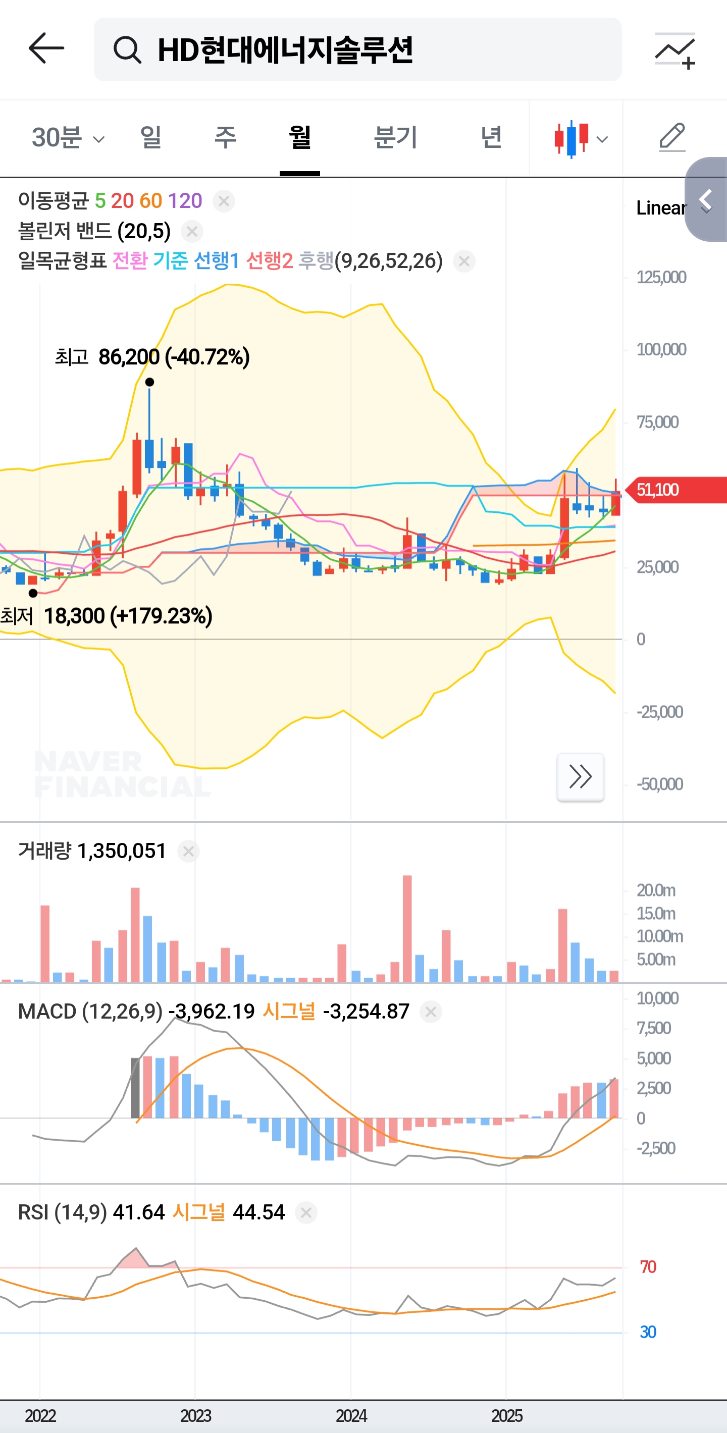 주가를 바라볼 때 단기·중기·장기로 구분해서 접근하는 것이 유용합니다. HD현대에너지솔루션은 최근 몇 달 동안 5만 원 선에서 지지와 저항을 반복하는 전형적인 박스권 흐름을 보이고 있습니다. 앞으로의 기술적 시나리오는 크게 세 단계로 나눌 수 있습니다.