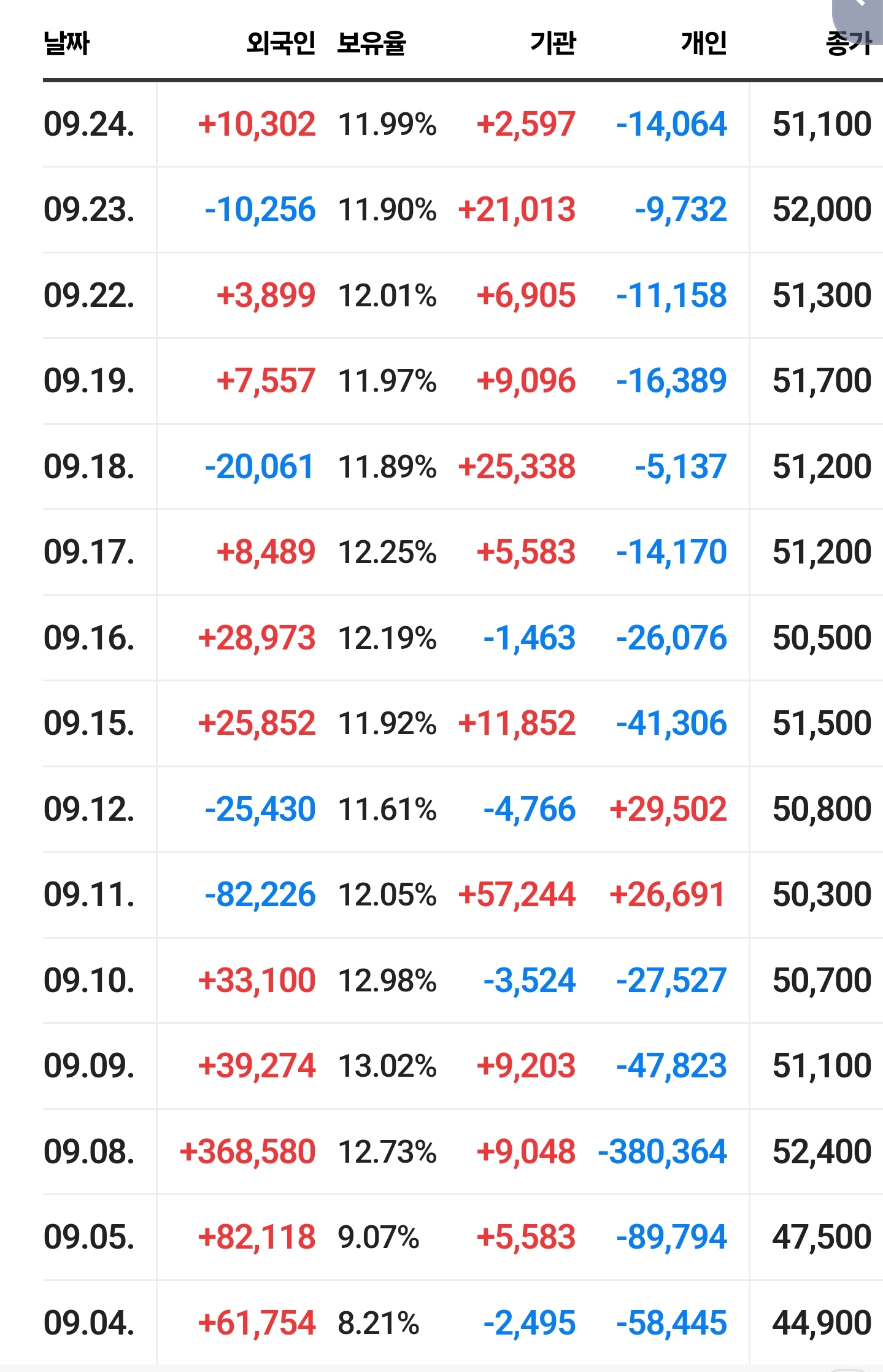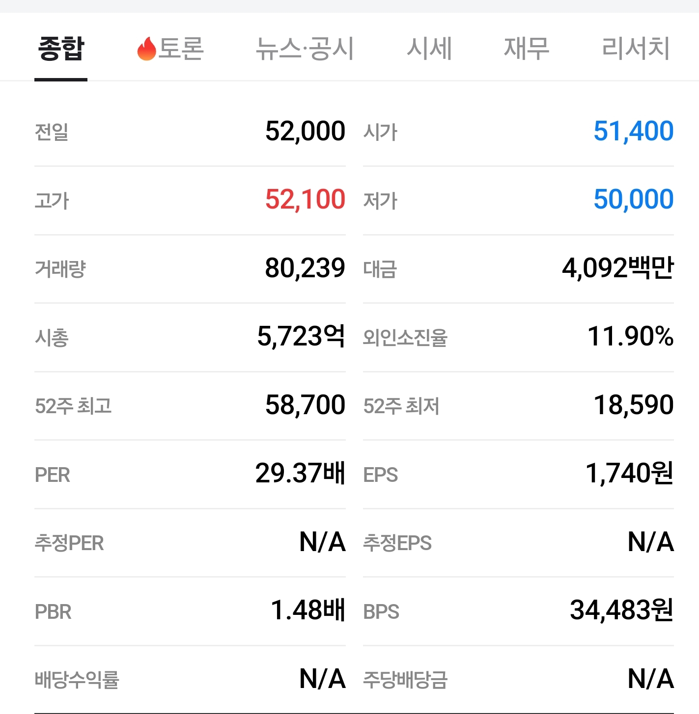 상승 시나리오: 52,000원 돌파에 성공한다면, 이전 고점인 58,000원(52주 신고가)을 재도전할 수 있습니다. 이는 투자자들에게 “추세 전환” 신호로 읽힐 가능성이 높습니다.