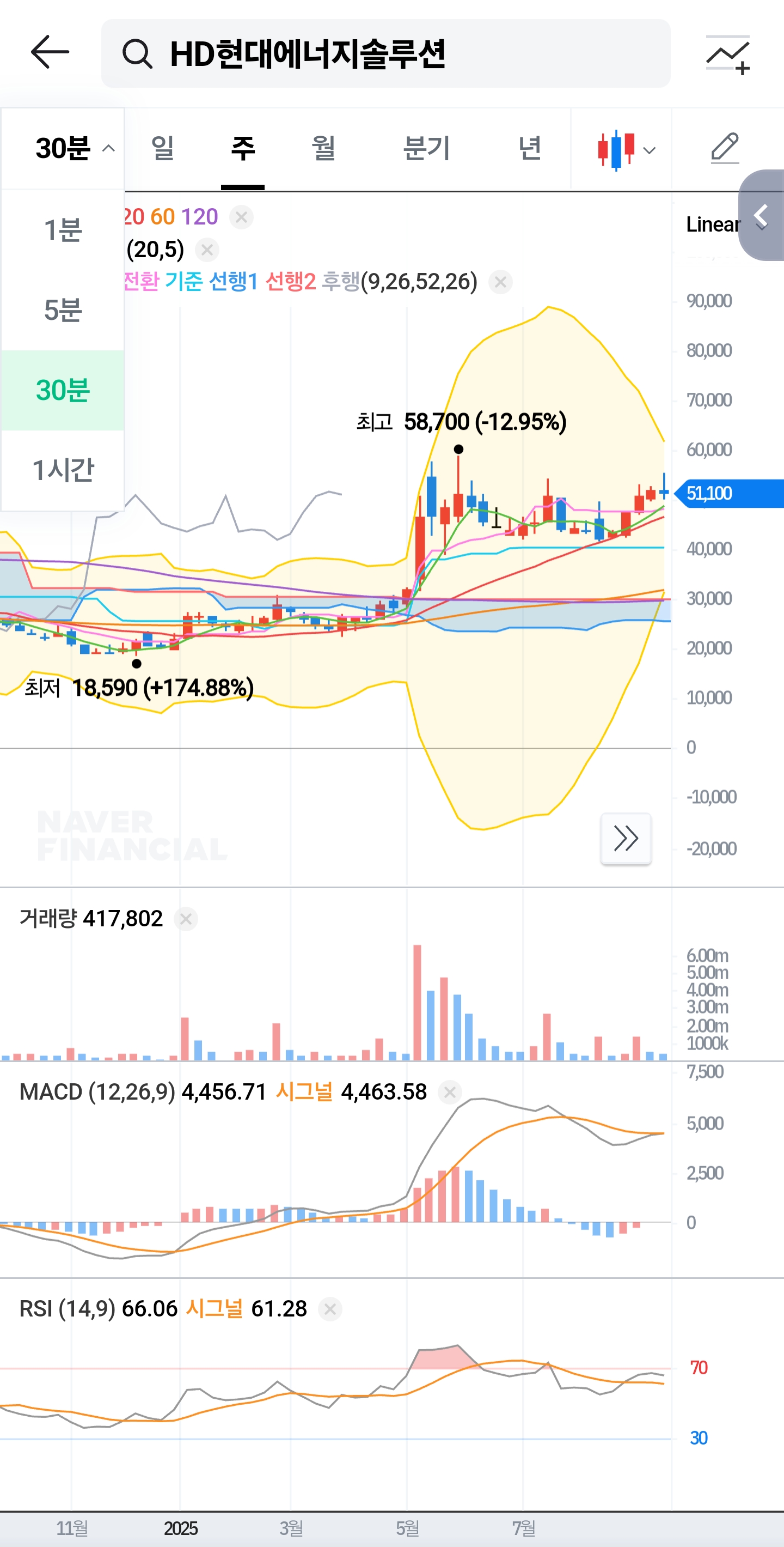 주간 차트에서는 58,700원 고점을 찍은 후 약 -12% 조정이 진행되었습니다.