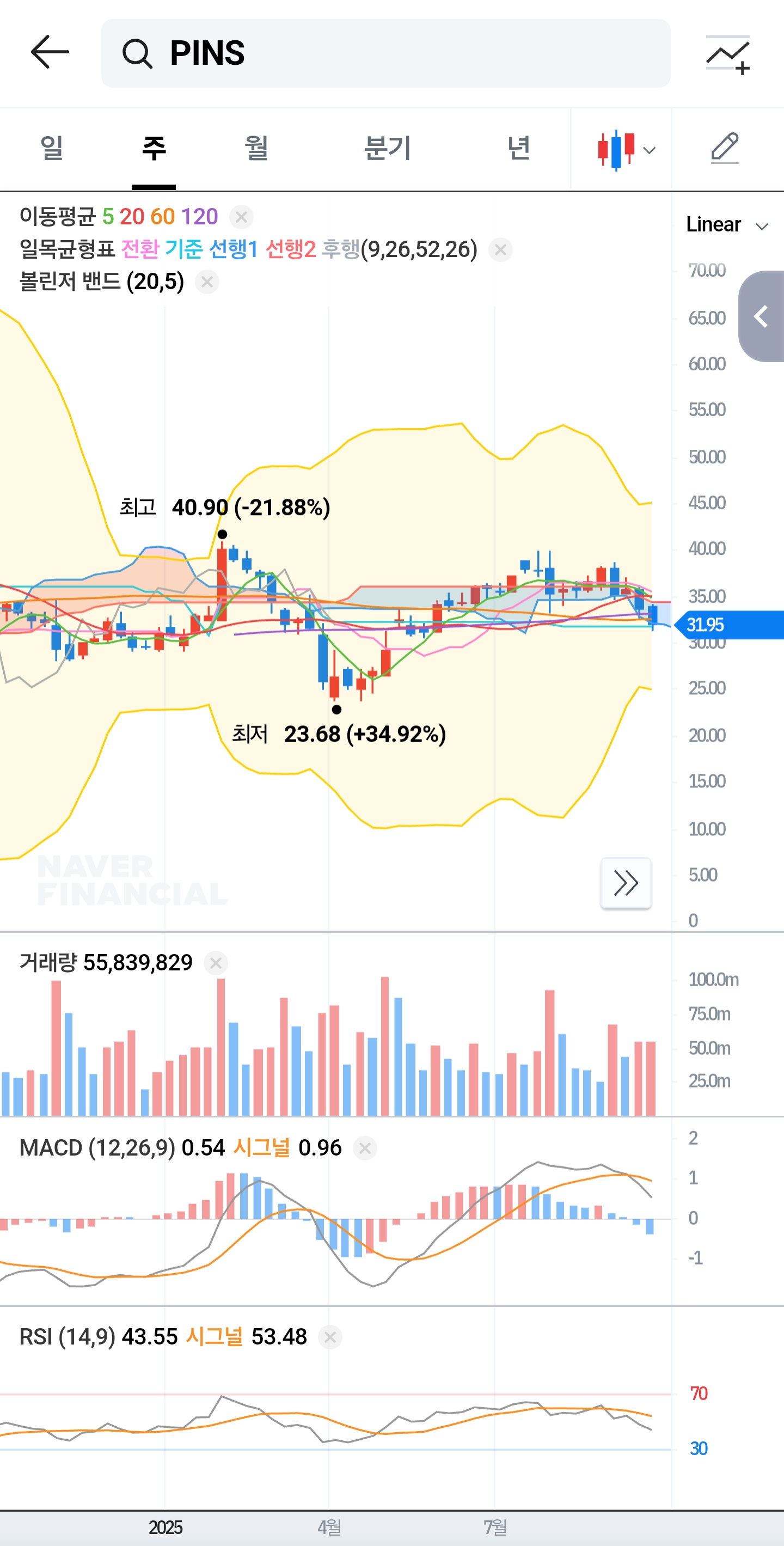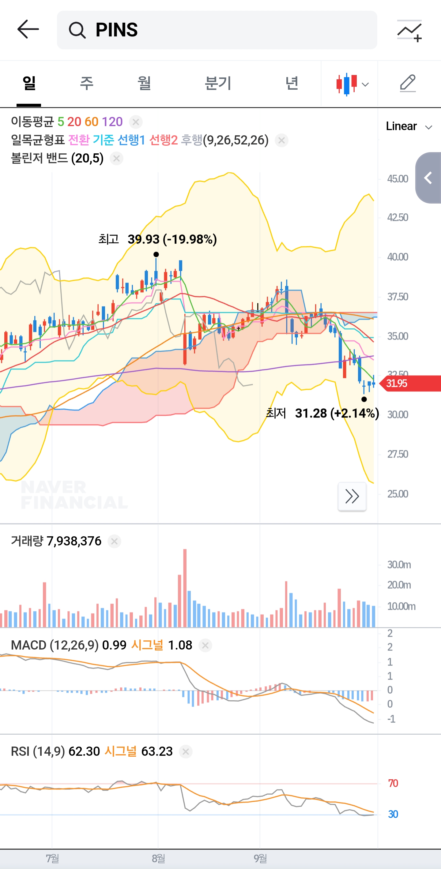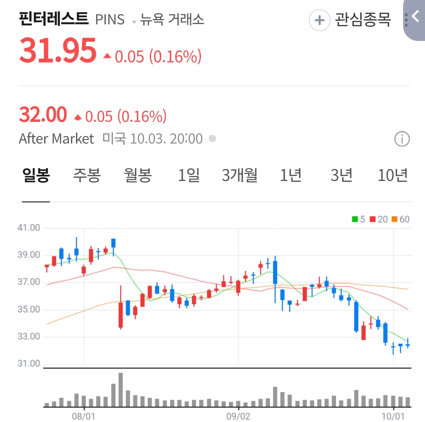 단기적으로 핀터레스트는 39달러대 고점 이후 빠르게 무너져 32달러 전후에서 버티고 있습니다. 이 구간은 과거에도 여러 번 지지선 역할을 한 자리로, 단기 매매자들은 이 가격대를 주목할 수밖에 없습니다.