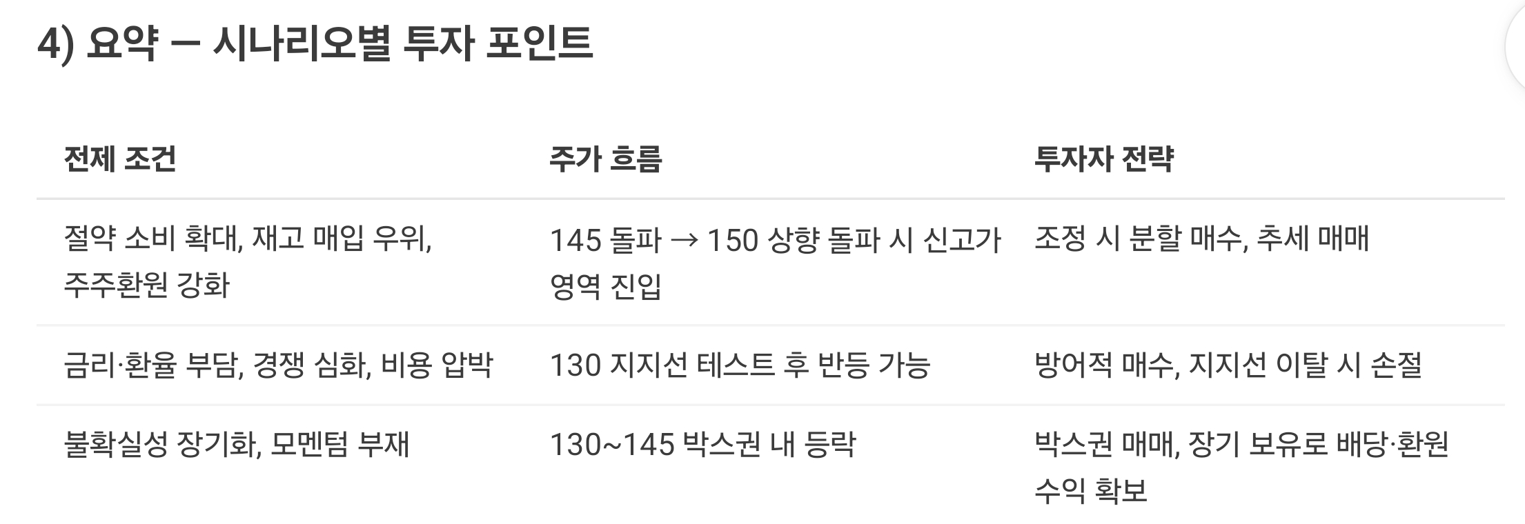 중기 투자자라면, 130달러 전후 지지 구간에서 분할 매수해 145달러 이상 구간에서 차익 실현하는 박스권 매매 전략을 고려할 수 있습니다.