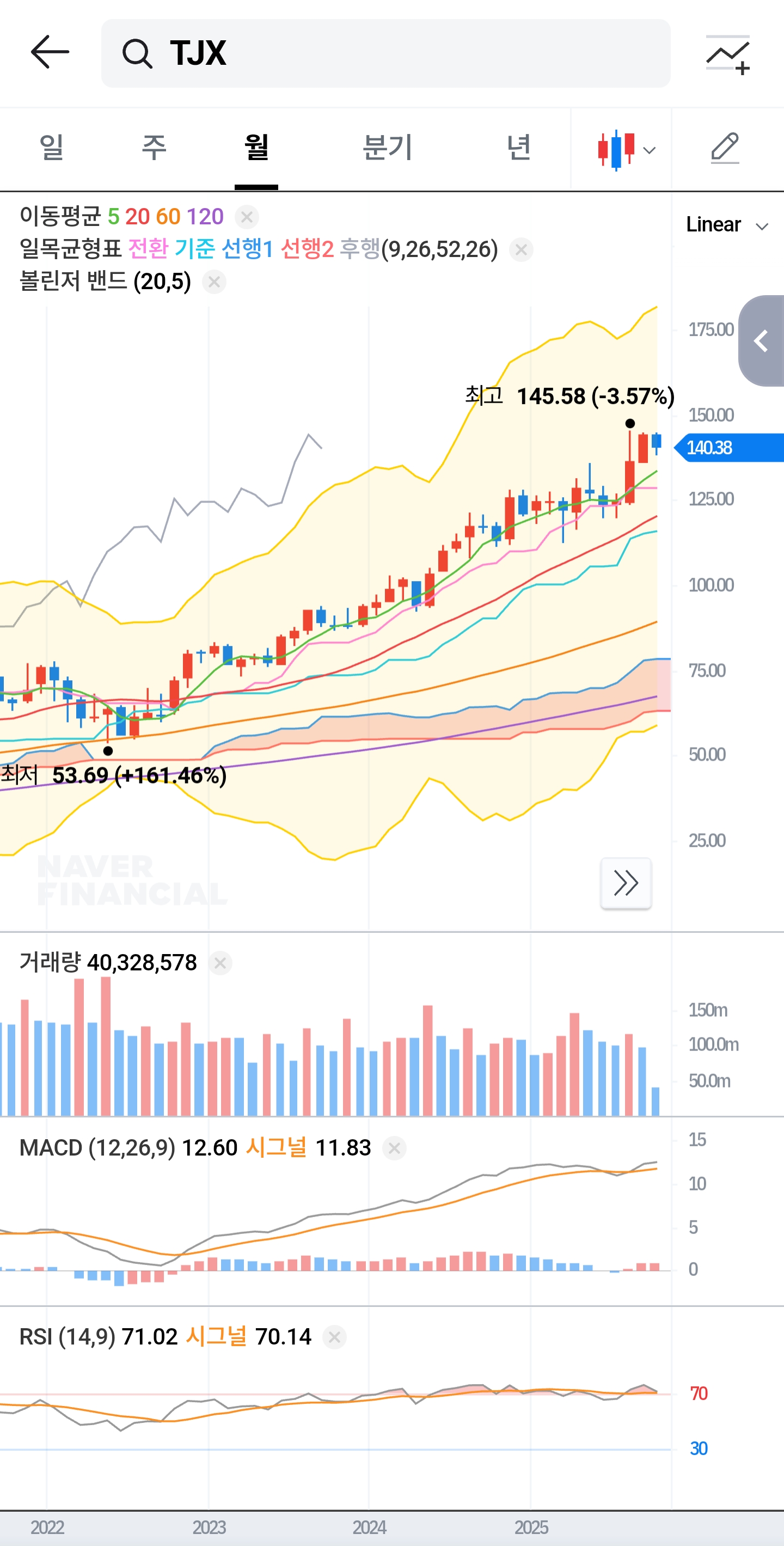 👉 장기적으로 볼 때 TJX는 여전히 성장성·방어성을 동시에 갖춘 강세 패턴을 유지하고 있습니다. 다만 단기·중기 조정을 거치면서 150달러 이상 돌파 시도를 하는 시나리오가 가장 현실적인 그림입니다.
