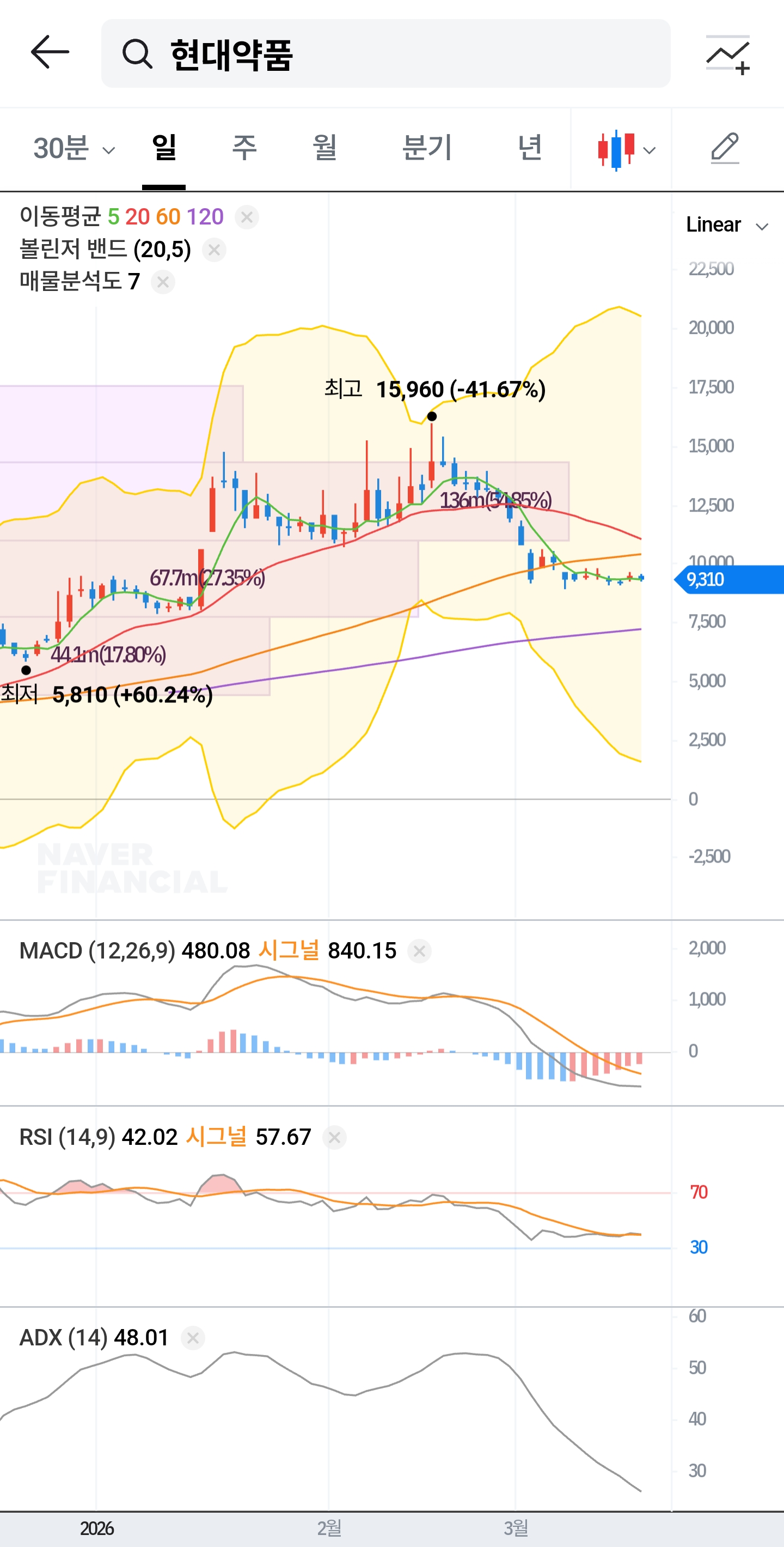 주식 시장에서 가장 고통스러운 순간은 언제일까요? 아마도 장밋빛 미래를 그리며 진입한 종목이 뚜렷한 이유 없이 계단식 하락을 이어갈 때일 것입니다. 오늘 분석할 '현대약품'의 일봉 차트가 바로 그러한 시장의 냉혹함을 여과 없이 보여주고 있습니다. 최고가 15,960원을 터치하며 환희에 찼던 순간부터, 무려 -41.67%라는 뼈아픈 조정을 겪으며 9,310원까지 밀려난 현재의 상황까지. 과연 이 하락의 끝은 어디일지, 차트가 말해주는 숨겨진 시그널을 통해 추적해 보겠습니다.